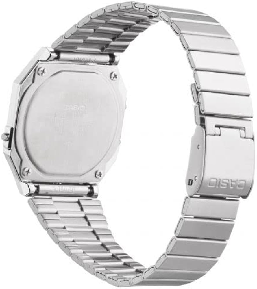 Reloj digital plateado con perfil ultra-delgado de 6 mm y cristal mineral. Diseño retro elegante con brazalete de acero inoxidable y luz LED.