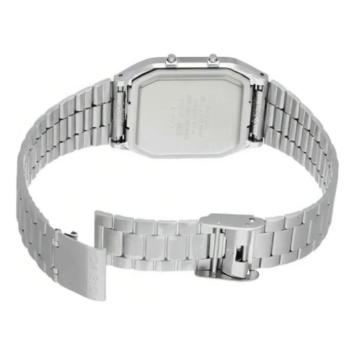 Icono retro de perfil ultra delgado con esfera plateada minimalista y brazalete de acero ajustable. Un diseño híbrido que fusiona la elegancia de las manecillas analógicas con la precisión de una pantalla digital en un solo vistazo.