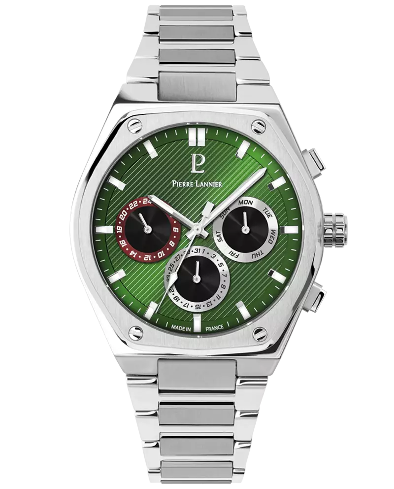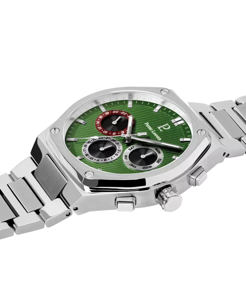 Reloj francés multifunción de cuarzo con caja octogonal de 42.5 mm en acero plateado, esfera verde bosque texturizada, cristal mineral y brazalete de acero integrado.