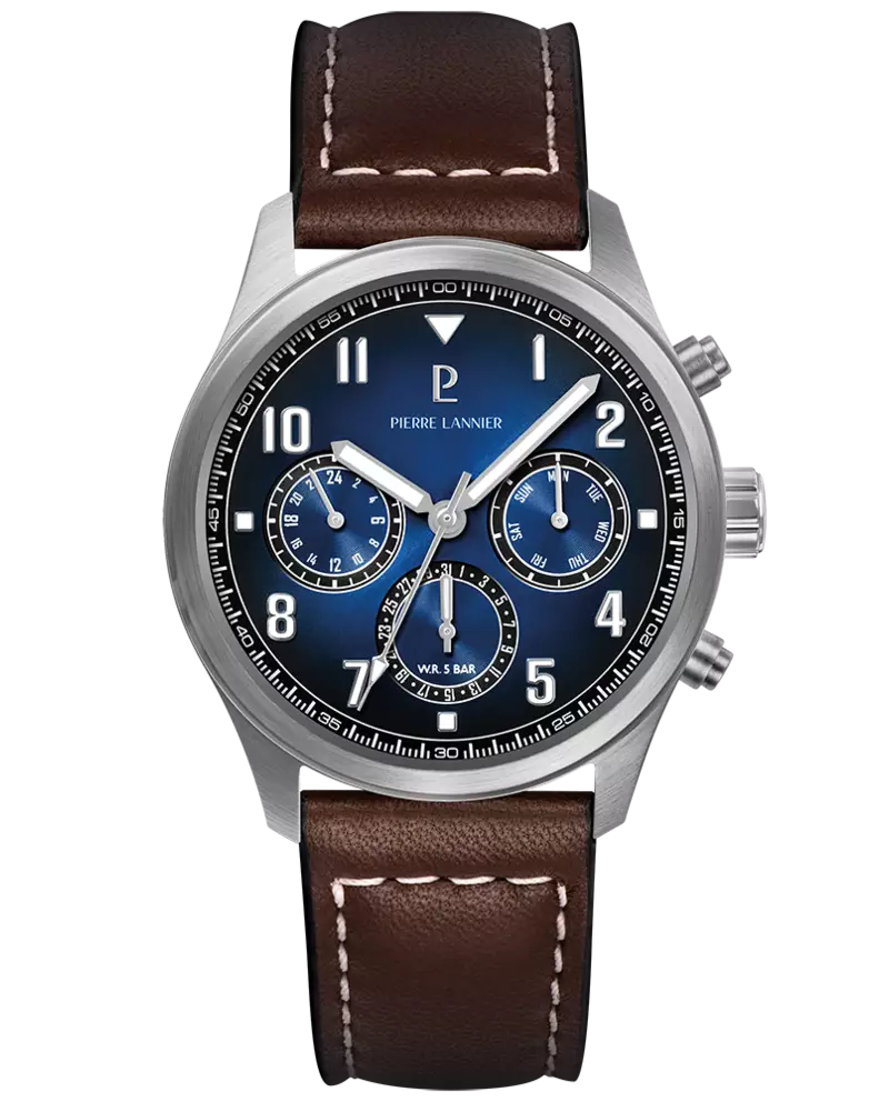 Reloj francés de cuarzo de 42.5 mm fabricado en acero inoxidable plateado, con esfera azul tornasolada tipo cronógrafo, cristal mineral y correa de cuero café.